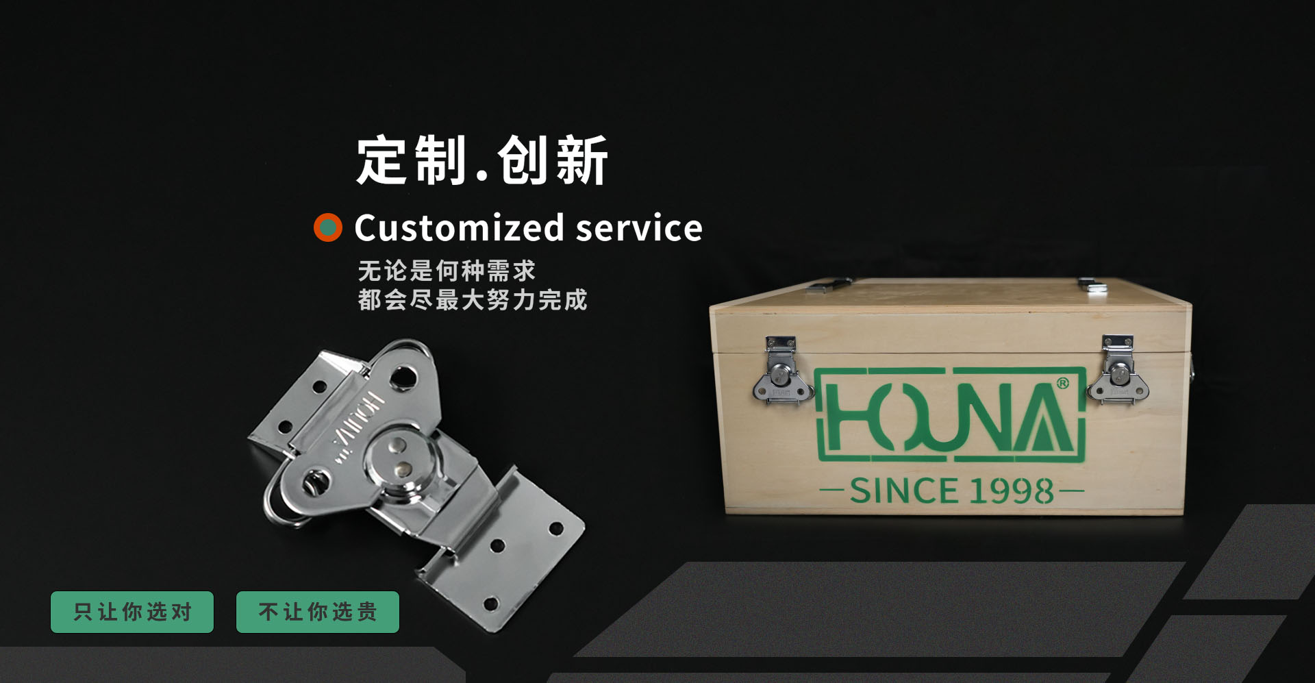 蘇州華納機電有限公司創于1998年;公司位于江蘇省蘇州市,隸屬蘇州潮汕商會理事單位,是一家專注木箱,航空箱,設備箱。各類箱體配套產品的研發與生產,主要生產蝴蝶鎖扣、搭扣、拉手、包角、木箱整套配件等等,箱體五金為主體業務的大型品牌。讓每個裝上HOUNA驊納產品的箱子擁有至高的品質;HOUNA驊納品牌擁有極高的市場口碑,專業的設計研發團隊;實驗室產品檢測團隊,科學的經營模式,質量(IS09001)及環境(ISO1400)管理體系標準化。曾被認定為《中國馳名商標》,《中國名牌》,《中國環境標志產品》,《服務、誠信、質量AAA級》并多次入選政府綠色采購清單。
